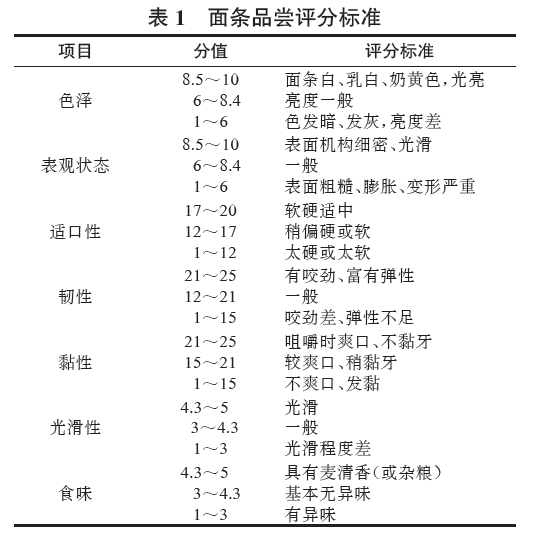 挂面的感官评价是按SB/T 10137— 1993《面条用小麦粉》中的面条评分标准执行的,*依靠检测人员凭借专业训练及经验进行感官评分,对评分人员要求高,可描述性比较模糊。