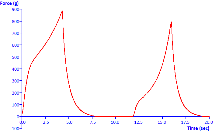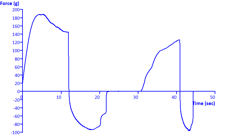 不是所有的产品都有脆性,但是在探头第1次压缩样品的过程中,当它们破裂时,在曲线有第1个峰的位置(在该处力值下降),出现脆性点。 | |||||