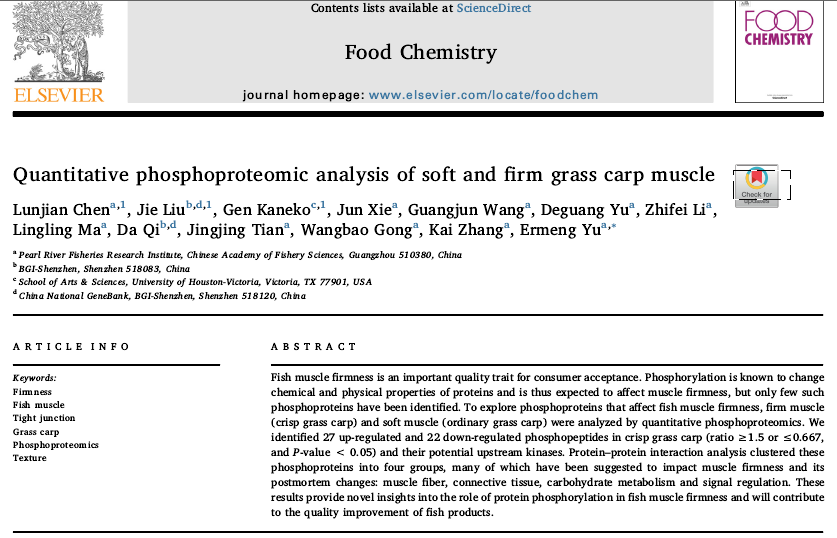 Technical articles2019年8月16日,食品期刊《Food Chemistry》(一区,IF=5.399)在线发表了中国水产科学研究院珠江水产研究所研究团队题为“Quantitative phosphoproteomic analysis of soft and firm grass carp muscle”的研究论文。