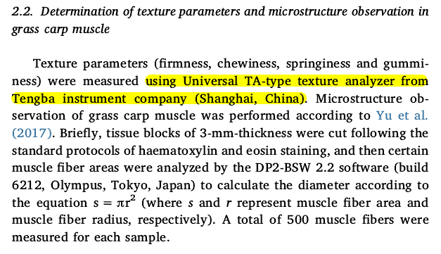 在该研究论文中,研究人员利用上海腾拔的Universal TA研究型国产质构仪用于测定草鱼肌肉的硬度、弹性、咀嚼性和内聚性。