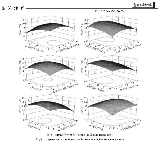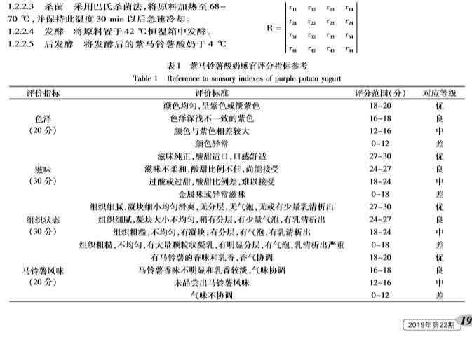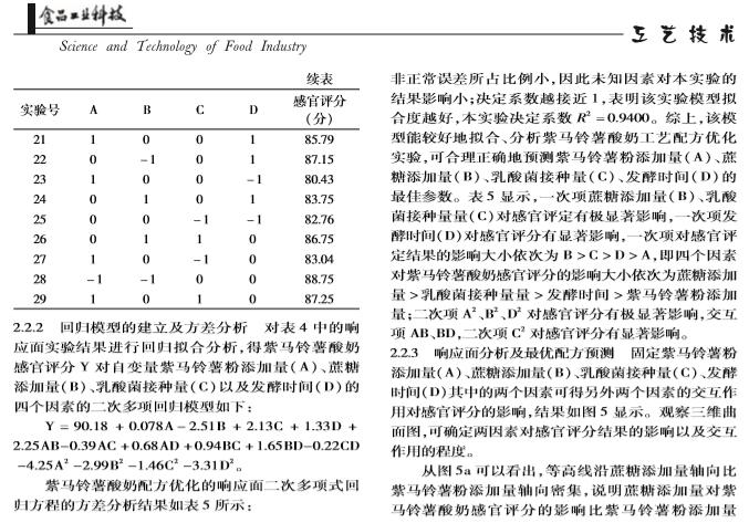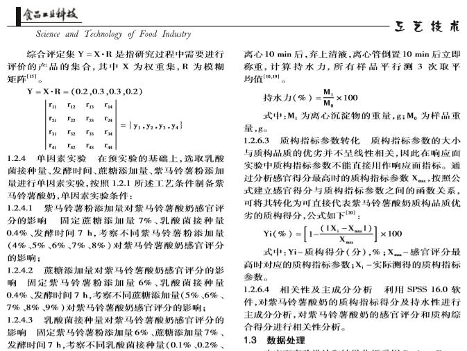 【摘要】:本实验在单因素实验的基础上,以模糊数学感官评分为指标,通过响应面实验设计对紫马铃薯酸奶的工艺及配方进行了优化,得到其*工艺配方为:乳酸菌添加量0.46%、发酵时间6.09 h、蔗糖添加量7.66%、紫马铃薯粉添加量5.90%、牛奶补足至100%。方差分析显示各因素对紫马铃薯酸奶感官评分的影响:蔗糖添加量乳酸菌添加量发酵时间紫马铃薯粉添加量。通过对紫马铃薯酸奶的质构指标进行主成分分析分析,提取出两个主成分,构建出了紫马铃薯酸奶的综合质构品质评价模型,应用此模型对紫马铃薯酸奶的品质进行评判具有可行性。
