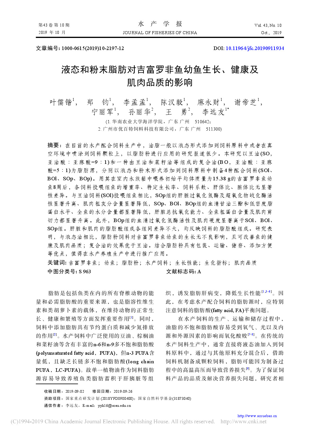 Technical articles2019年10月,国内期刊《水产学报》在线发表了华南农业大学海洋学院研究人员题为"液态和粉末脂肪对吉富罗非鱼幼鱼生长、健康及 肌肉品质的影响"的研究论文。在该论文中,研究人员用上海腾拔仪器公司的Universal TA质构仪测定罗非鱼肌肉的剪切力、硬度、弹性、回复性和咀嚼性。