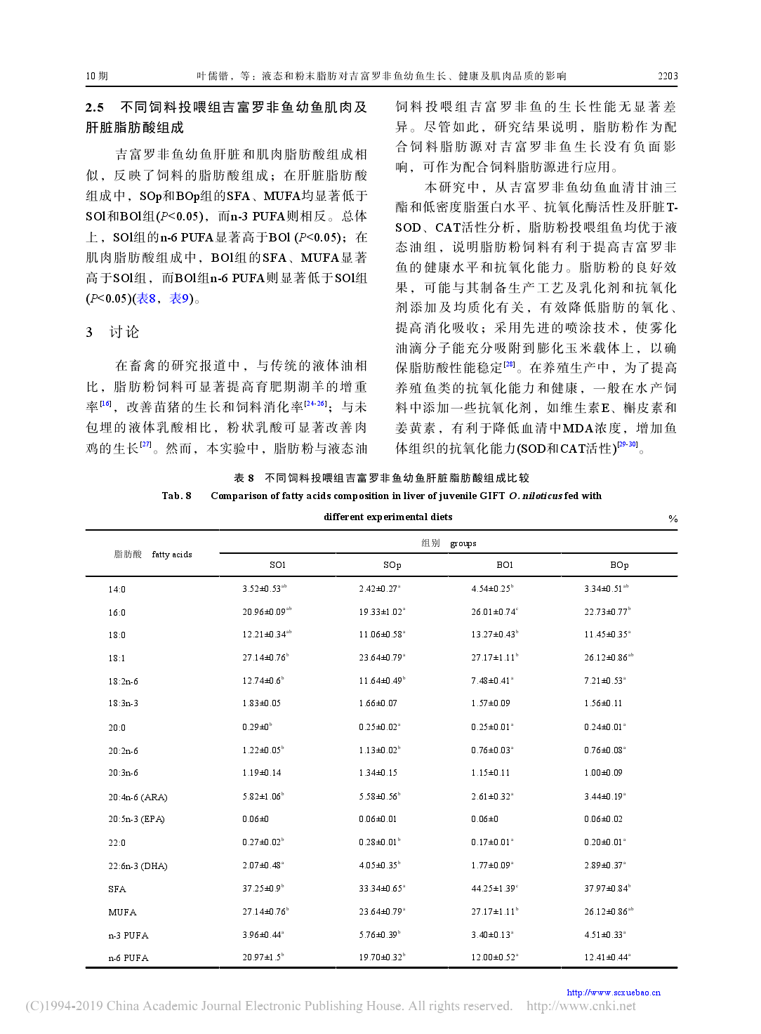 摘要:在目前的水产配合饲料生产中,油脂一般以液态形式添加到饲料原料中或者在真 空环境中喷涂到饲料颗粒上,以脂肪粉进行应用的研究报道很少。本研究以豆油(SO, 亚油酸∶亚麻酸=9∶1)和一种由豆油和菜籽油等组成的复合油(BO,亚油酸∶亚麻 酸=5∶1)为脂肪源,分别以液态和粉末形式添加到饲料原料中制备4种配合饲料(SOl、 BOl、SOp、BOp)。用其在室内水族箱中喂养初始平均体质量为15.38 g的吉富罗非鱼幼 鱼8周后,各饲料投喂组鱼的增重率、特定生长率、饲料系数、肝体比、脏体比无显著 性差异。与豆油饲料(SOl)投喂组鱼相比,SOp组的肝脏过氧化氢酶及超氧化物岐化酶活 性显著升高、肌肉粗灰分含量显著降低,SOp、BOl、BOp组的血清甘油三酯和低密度脂 蛋白水平、全鱼的水分含量都显著降低,肝脏总抗氧化能力、全鱼粗蛋白含量及肌肉剪 切力都显著升高。此外,BOp组的血清过氧化氢酶活性及肌肉硬度显著高于SOl、BOl、 SOp组。肝脏和肌肉的脂肪酸组成各组间差异不大,均反映饲料的脂肪酸组成。研究表 明,与液态油相比,脂肪粉饲料对吉富罗非鱼幼鱼的生长无不良影响,且可改善鱼的健 康及肌肉品质;复合油的效果优于豆油。结合脂肪粉具有包装、运输、储存、添加方便 等优点,值得在水产养殖生产中进行推广应用。
