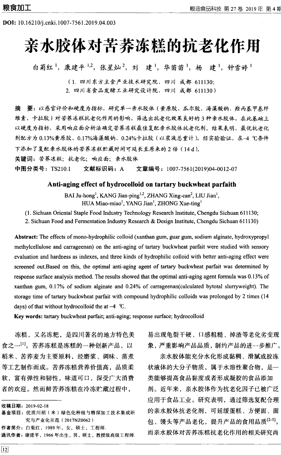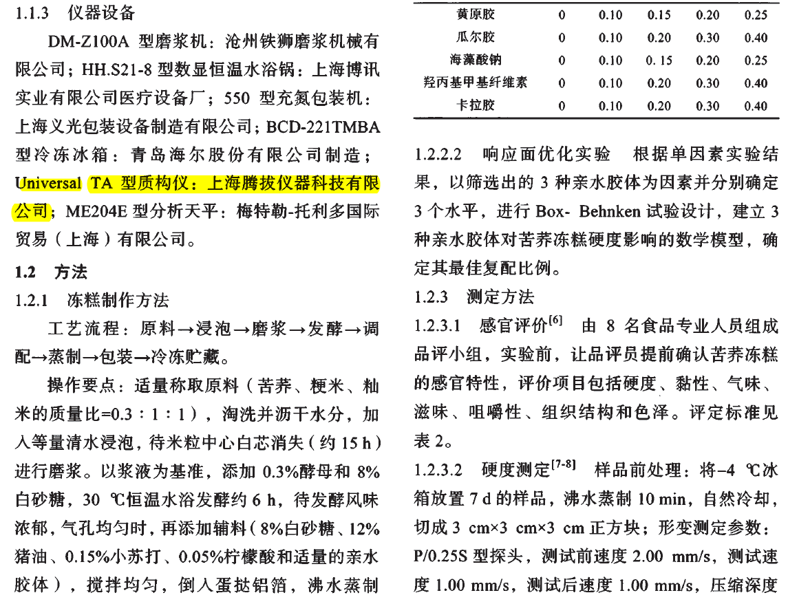 Technical articles2019年,四川东方主食产业技术研究院研究人员在国内期刊《粮油食品科技》在线发表了题为“亲水胶体对苦荞冻糕的抗老化作用”的研究文章。在该论文中,研究人员使用上海腾拔仪器科技有限公司的Universal TA质构仪来测定苦荞冻糕的硬度。