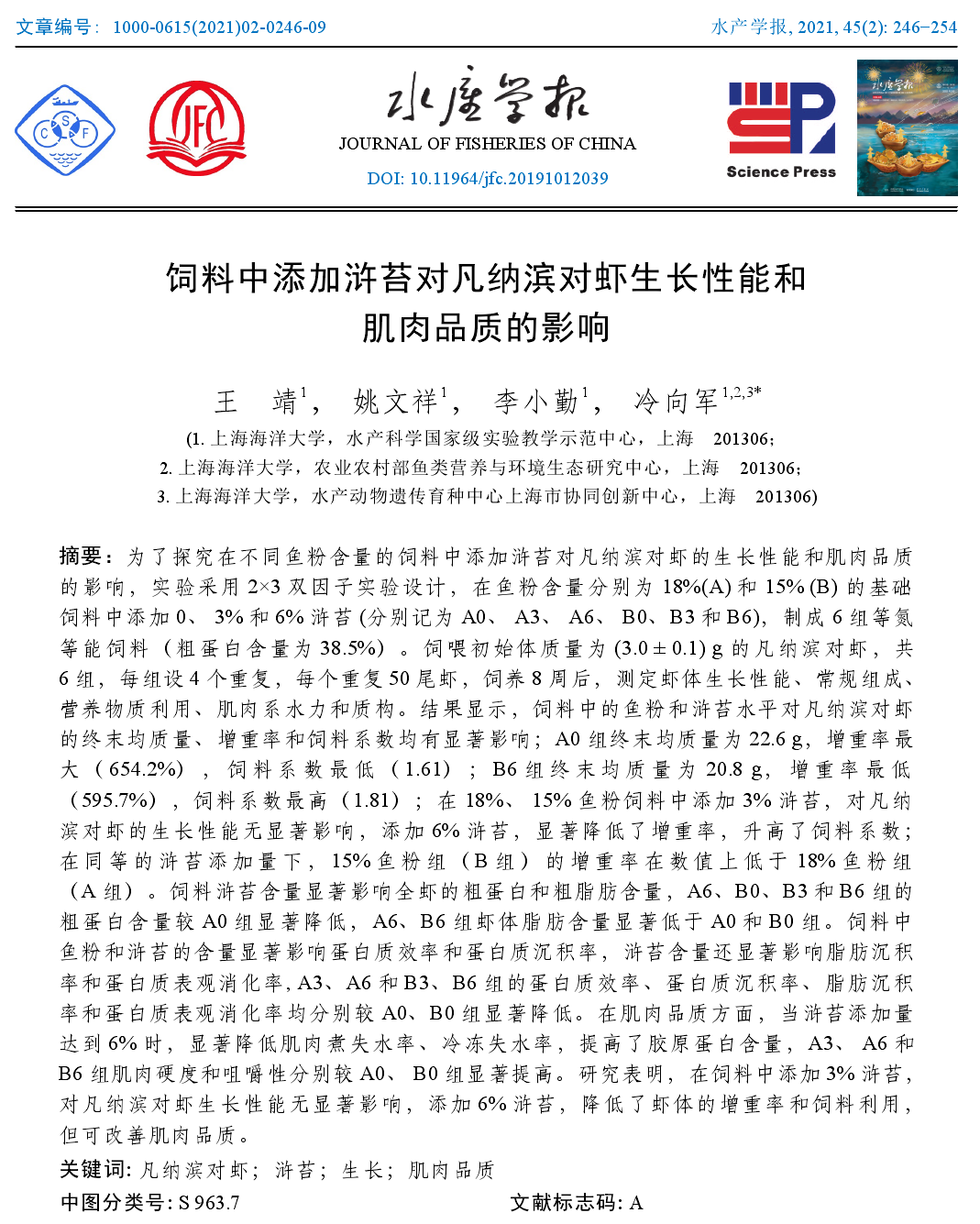 摘要:为了探究在不同鱼粉含量的饲料中添加浒苔对凡纳滨对虾的生长性能和肌肉品质的影响,实验采用2×3 双因子实验设计,在鱼粉含量分别为 18%(A) 和 15% (B) 的基础饲料中添加 0、 3% 和6% 浒苔 (分别记为A0、 A3、 A6、 B0、B3 和B6),制成 6 组等氮等能饲料(粗蛋白含量38.5%)。饲喂初始体质量为(3.0 ± 0.1) g 的凡纳滨对虾,共6 组,每组设4 个重复,每个重复50 尾虾,饲养 8 周后,测定虾体生长性能、常规组成、营养物质利用、肌肉系水力和质构。结果显示,饲料中的鱼粉和浒苔水平对凡纳滨对虾的终末均质量、增重率和饲料系数均有显著影响;A0 组终末均质量为22.6 g,增重率最大( 654.2%) , 饲料系数zui低( 1.61) ; B6 组终末均质量为20.8 g, 增重率zui低(595.7%),饲料系数最高(1.81);在 18%、 15% 鱼粉饲料中添加 3% 浒苔,对凡纳滨对虾的生长性能无显著影响,添加 6% 浒苔,显著降低了增重率,升高了饲料系数;在同等的浒苔添加量下, 15% 鱼粉组( B 组) 的增重率在数值上低于18% 鱼粉组(A 组)。饲料浒苔含量显著影响全虾的粗蛋白和粗脂肪含量,A6、B0、B3 和B6 组的粗蛋白含量较A0 组显著降低,A6、B6 组虾体脂肪含量显著低于A0 和B0 组。饲料中鱼粉和浒苔的含量显著影响蛋白质效率和蛋白质沉积率,浒苔含量还显著影响脂肪沉积率和蛋白质表观消化率, A3、A6 和B3、B6 组的蛋白质效率、蛋白质沉积率、脂肪沉积率和蛋白质表观消化率均分别较A0、B0 组显著降低。在肌肉品质方面,当浒苔添加量达到6% 时,显著降低肌肉煮失水率、冷冻失水率,提高了胶原蛋白含量,A3、 A6 和B6 组肌肉硬度和咀嚼性分别较A0、 B0 组显著提高。研究表明,在饲料中添加3% 浒苔,对凡纳滨对虾生长性能无显著影响,添加6% 浒苔,降低了虾体的增重率和饲料利用,但可改善肌肉品质。