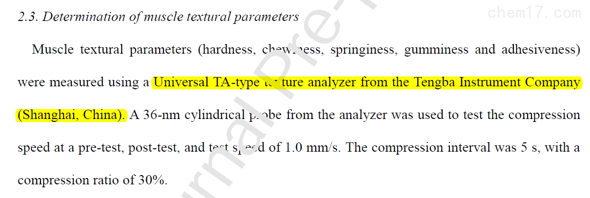 Technical articles近日,中国水产科学研究院珠江水产研究所在农林科学领域TOP期刊《Aquaculture》(IF=4.242)在线发表了题为“Reactive oxygen species (ROS)-mediated regulation of muscle texture in grass carp fed with dietary oxidants"的研究论文,在该研究论文中,研究人员利用上海腾拔Universal TA研究型质构仪测定草鱼的硬度、弹性、咀嚼性和粘附性等指标。这是上海腾拔质构仪助力珠江水产研究所在国际期刊《Aquaculture》、《Food Chemistry》和《Foods》发表论文后,再次助力珠江水产研究所在国际期刊《Aquaculture》发表论文。