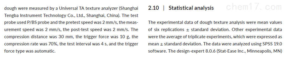 Technical articles2021年,河北科技大学和石家庄学院研究人员联合在国际食品期刊《Journal of Food Processing and Preservation》(IF=2.190)发表了题为"Optimization of chestnut starch acetate synthesis by response surface methodology and its effect on dough properties“的研究论文。在该论文中,研究人员利用上海腾拔Universal TA研究型质构仪测定了面团的硬度和韧性。