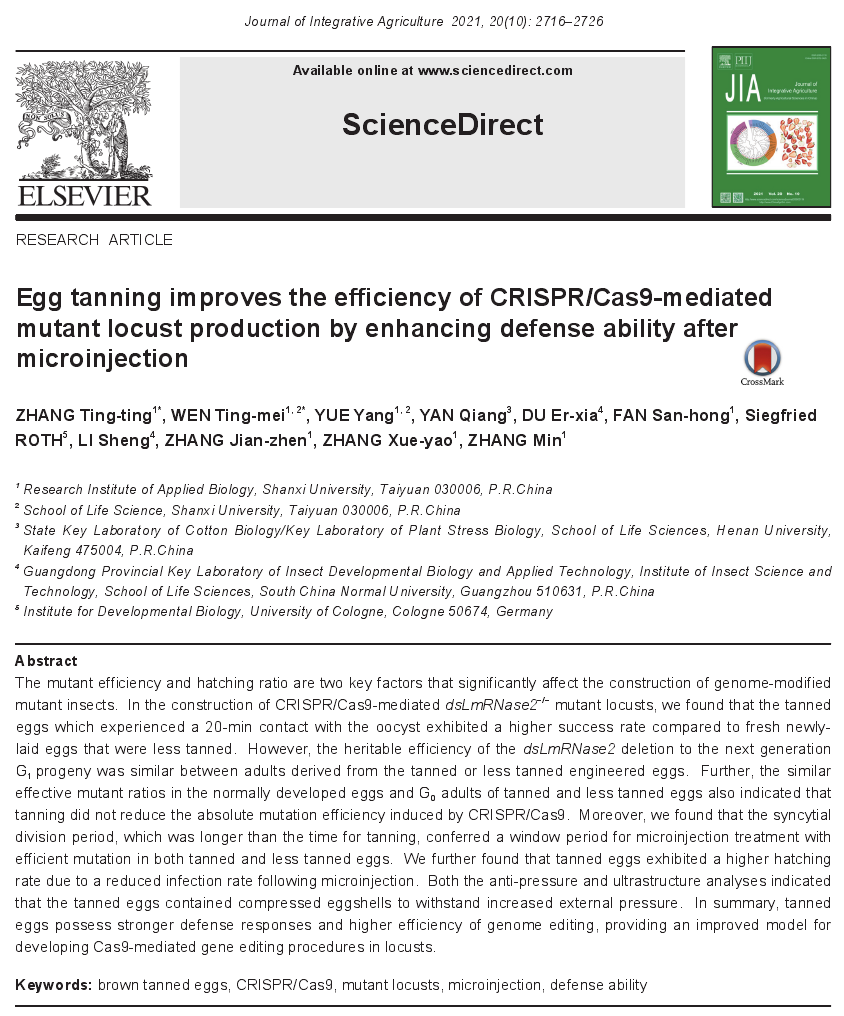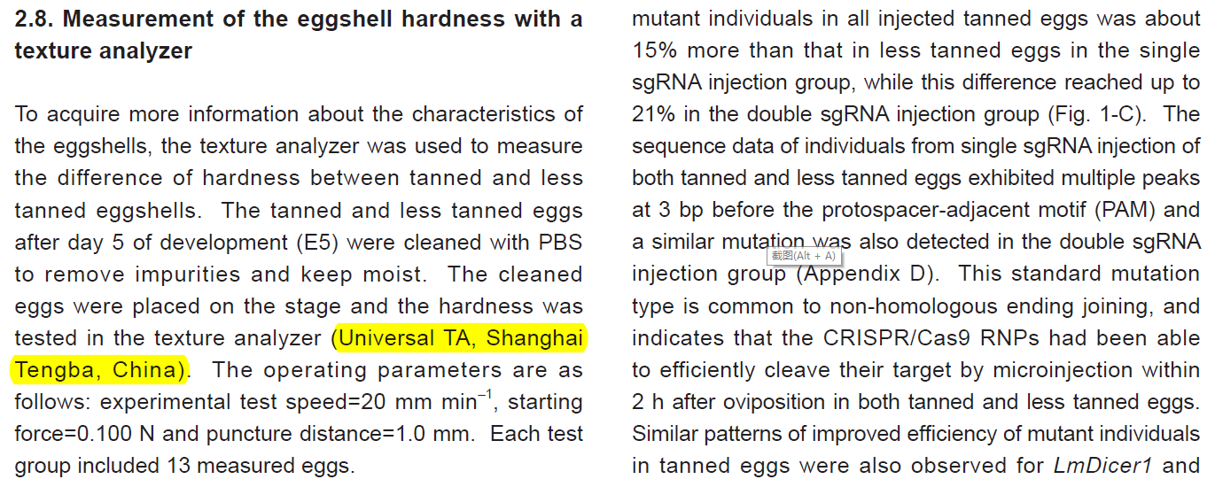 Technical articles近期,山西大学应用生物学研究所研究人员在农林科学领域国际期刊《Journal of Integrative Agriculture 》(IF=2.848)发表了题为"Egg tanning improves the efficiency of CRISPR/Cas9-mediated mutant locust production by enhancing defense ability after microinjection"的研究论文。在该研究论文中,研究人员利用上海腾拔Universal TA研究型质构仪测定蛋壳的硬度。