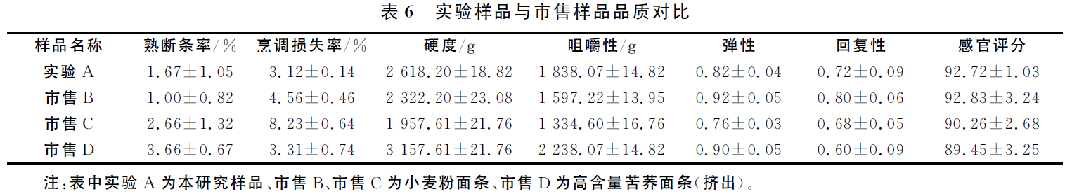 将烹调好的样品挂置P/SPR面条拉伸装置,进行测试,每个样品重复6次。测试参数设定如下:测前速度1mm/s;测试速度3.3mm/s;测后速度10mm/s;触发力:5g;拉伸距离35mm。