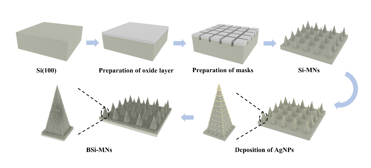 硅微针(Si-MN)具有创伤小、容易加工和应用等特点,是经皮给药药物递送的一种有前景的策略。传统的Si-MN阵列经常通过使用微机电系统(MEMS)过程来制备,价格昂贵,不适合大规模制造和应用。另外,硅微针具有一个光滑的表面,使其很难实现高剂量药物递送。研究人员证实了一个固体策略来制备具有超亲水表面和可用于高药物运载的一种新型黑硅微针(BSi-MN)贴片。提出的策略包括普通硅微针简单制备和黑硅纳米线的随后制备两部分。首先,通过激光制图和碱腐蚀组成的一个简单方法来制备普通的硅微针。然后,通过银催化化学腐蚀在普通硅微针表面制备纳米线结构,从而形成BSi-MNs。研究人员详尽探究了银纳米粒子沉积期间银离子和氢氟酸浓度以及银催化化学腐蚀期间氢氟酸/氢氟酸+过氧化氢比例对BSi-MNs形态和性质的影响。