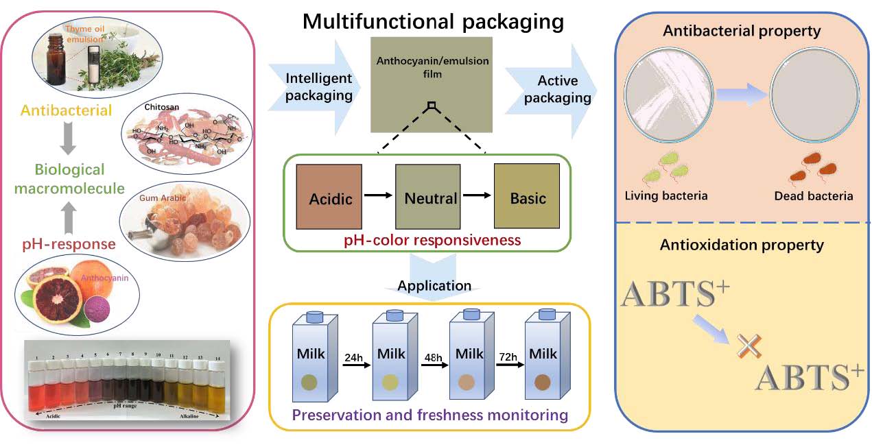 Novel multifunctional food packaging was developed by incorporating blood orange anthocyanins (BOA) and thyme oil (TO) emulsion into a chitosan-gum Arabic film matrix. The basic properties, pH/volatile acid sensitivity, and functional characteristics of the multifunctional films were investigated. BOA solution illustrated significant color variations (from pink to violet to yellow) under different pH environments. The incorporation of anthocyanin and emulsion enhanced the UV–vis blocking, which made the film block almost all UV light. Meanwhile, the multifunctional film had stronger mechanical strength and thermal stability, whose elongation at break reached 76.1%, and the maximum degradation temperature raised to 305 °C. The incorporation of TO emulsion significantly enhanced the films' water resistance and made the water vapor barrier properties of the films reduce to 6.34 × 10−11 g/Pa•h•m. In addition, the multifunctional films exhibited noticeable changes of color in acid/alkaline environments within a short time interval, which could be easy to distinguish by naked eyes. The addition of emulsion made the multifunctional films slow-release of thyme oil, which significantly improved the antioxidant and dynamic antibacterial capacity of the films. Finally, the multifunctional films effectively extended the shelf-life of milk at 25 °C and visually monitored freshness through the color changes in real-time. This knowledge provides a new perspective and idea to develop multifunctional food packaging materials with preservation and monitoring functions.